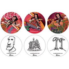 [emoji:76]John Holmstrom氏が描いたロックンロール世界旅行のジャケットイラストを大胆に切り抜いた缶バッヂのセット。