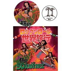 [emoji:76]John Holmstrom氏が描いたロックンロール世界旅行のジャケットイラストを大胆に切り抜いた缶バッヂとジャケットのイラストのステッカーのセット。