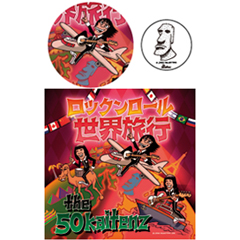 [emoji:76]John Holmstrom氏が描いたロックンロール世界旅行のジャケットイラストを大胆に切り抜いた缶バッヂとジャケットのイラストのステッカーのセット。