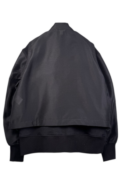 スパンポリエステルを使用した珍しい中肉のオーガンジーを使用したシースルーのベストとMA-1デザインの裏毛×オーガンジースリーブのジップアップジャケットのセット。同色異素材+シースルーの奥行きが美しく様々な見え方とコントラスト、幅広いスタイリングを楽しめるユーティリティーアイテムです。Quality