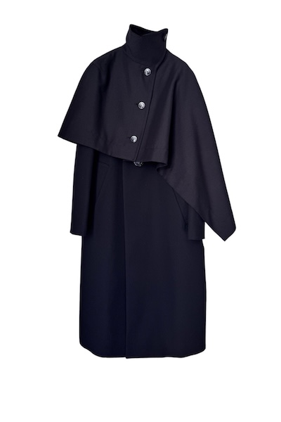 アシンメトリーなケープデザインが目を引く、2wayコート。オーストラリア、グランピアンズ地方のトレーサビリティウールで打ち込みに非常にこだわったウールのハイカウントシャンブレー素材を使用。本体はすっきりとしたノーカラーコート。フロントに使用したインパクトのある大きめの釦がミニマルなデザインにさりげなく個性をプラスしてくれます。アシンメトリーなシルエットは動きにニュアンスを与え着るだけでスタイリングを引き立ててくれます。