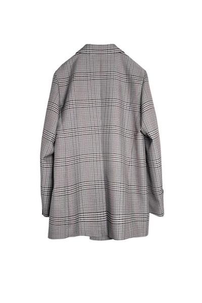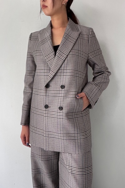 ポリエステルをブレンドしたチェック柄のウールギャバジン素材を使用したダブルブレスジャケット。適度なハリ感があり、エレガントさとマニッシュな雰囲気を兼ね備えた一着です。