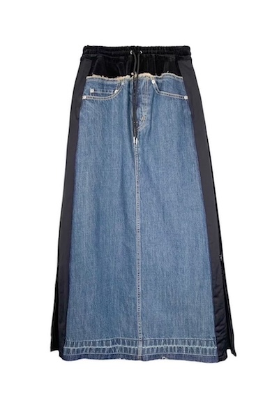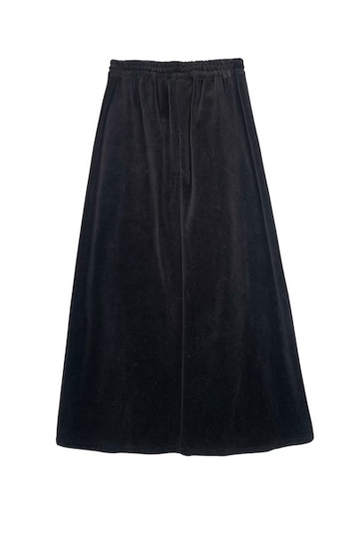 デニム×ベロアの異素材MIXが目を惹くスポーティーラグジュアリーなスカート。前後で見え方の変化を楽しめ、ウエストの切り替えデザインは前から見るとデニムスカートをレイヤードしたようなデザインに。サイドに施されたマットサテンのラインがスポーティな印象をあたえつつ、スタイリングのアクセントになります。