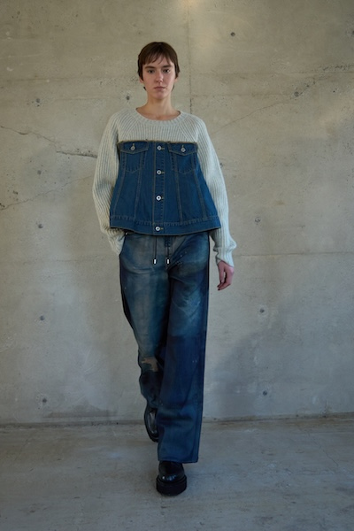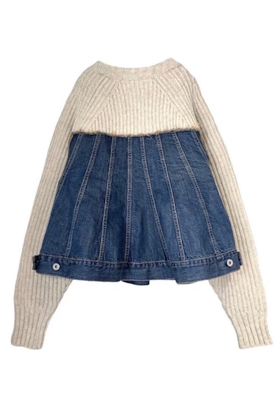ウール100%の程よい肉感のニットとデニムのペプラム切替を大胆にドッキングしたメリハリのあるリズミカルなシルエットのトップス。