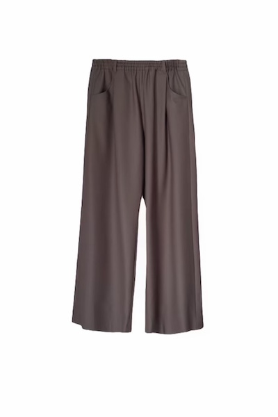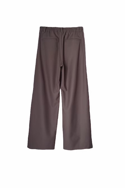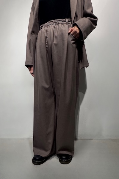 オーストラリア産バージンウール Super100’s とビスコースをブレンドした程よい温かみと、柔らかさ・落ち感のある上品な風合いが魅力的な素材を使用したワイドパンツ。ウエストはゴム仕様でストレスフリーな穿き心地。フロントタックから立体的なポケットデザインがアクセントになり、シンプルながらもリラックス感のあるシルエットで、ON/OFF問わず幅広く活躍します。