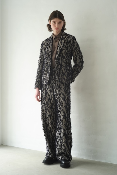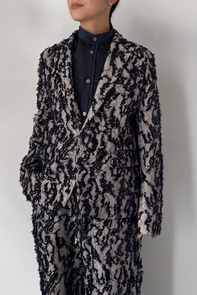 デニムのような表情を持つデニムライクなジャカード生地を使用したジャケット。表面にはフリンジのような立体感があり、動くたびに奥行きのあるニュアンスを楽しめます。カジュアルな素材感にテーラードジャケットのシルエットできちんと感をプラス。一枚で存在感のあるスタイリングを叶えてくれます。同素材のパンツとのセットアップもオススメです。Quality