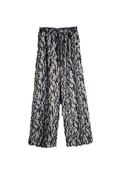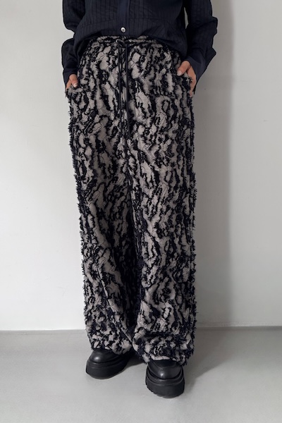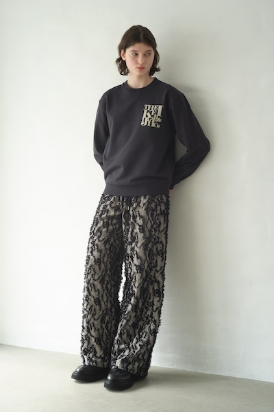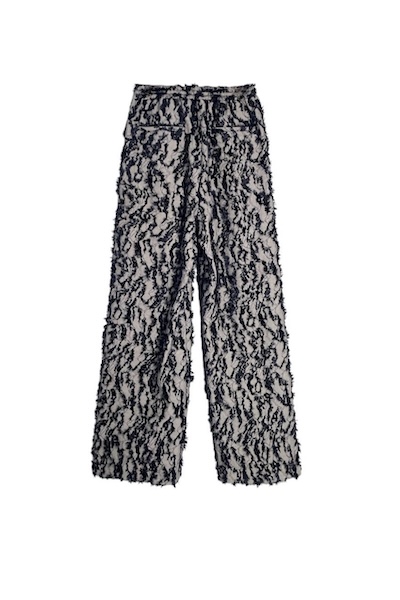 デニムのような表情を持つデニムライクなジャカード生地を使用したワイドパンツ。表面にはフリンジのような立体感があり、動くたびに奥行きのあるニュアンスを楽しめます。ウエストはゴム+ドローコードでストレスフリー。リラックス感のある穿き心地ながら、存在感のある素材でスタイリングをぐっと華やかにしてくれます。同素材のジャケットとのセットアップもオススメです。