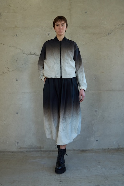 表情の異なる2つの顔を楽しめるリバーシブルジャケット。ナイロンの素材にケーブルニット柄をプリントしたオリジナルファブリックを使用。リアルなケーブルニットの表情と目を惹くグラデーションが立体感を生み出しスタイリングに奥行きをプラスします。裏側はシンプルに単色のワークジャケットデザイン。裏と表の表情の変化と軽さや機能性も兼ね備えたディテールが魅力的な1着です。単品でも高い汎用性を持ちつつ、リバーシブルジャケット、スカート、ベストの3ピースを合わせることで完成度の高いスタイリングが実現します。Quality
