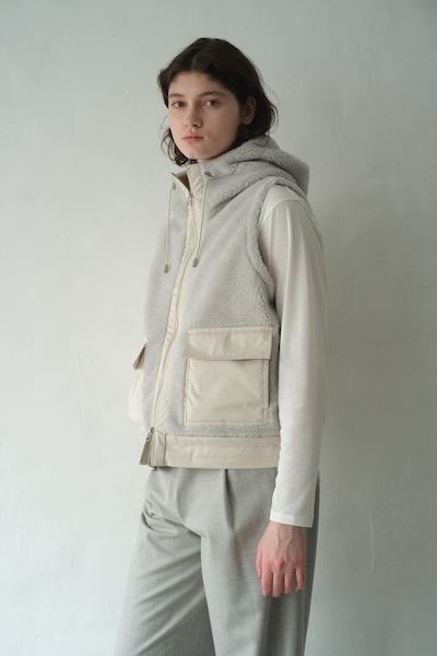 柔らかくふくらみのあるラメ混ボアを使用したシーズンムード漂うフーディーベスト。フロントジップ部分やポケット、裾にはマットな質感のポリエステル素材を使用し異素材MIXがこなれた印象を与えてくれます。程よいボリューム感がありつつも軽やかで様々なアイテムとのレイヤードスタイルをお楽しみいただけます。実用性を考えたディテールも取り入れたIJIIT& Co.らしいスポーティーラグジュアリーな1着です。
