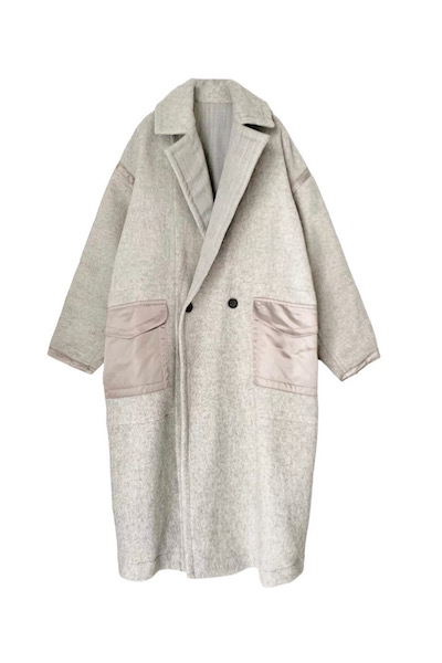 1枚の素材をメインに表裏でまったく表情の違うデザインのアウターを作成。素材は上質なジーロンファーストラムを使用したラムウール。美しい艶感とソフトな風合い、なめらかな肌触りが魅力的です。シルエットはオーバーサイズチェスターコート。抜け感のある大きめなサイジングやビッグカラー、ゆとりのあるスリーブデザインは羽織るだけでこなれた感を与え着こなしを格上げしてくれます。別布に使用したナイロン素材は艶感が美しくラグジュアリーな印象に仕上げています。Quality