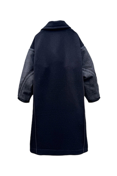 1枚の素材をメインに表裏でまったく表情の違うデザインのアウターを作成。素材は上質なジーロンファーストラムを使用したラムウール。美しい艶感とソフトな風合い、なめらかな肌触りが魅力的です。シルエットはオーバーサイズチェスターコート。抜け感のある大きめなサイジングやビッグカラー、ゆとりのあるスリーブデザインは羽織るだけでこなれた感を与え着こなしを格上げしてくれます。別布に使用したナイロン素材は艶感が美しくラグジュアリーな印象に仕上げています。Quality