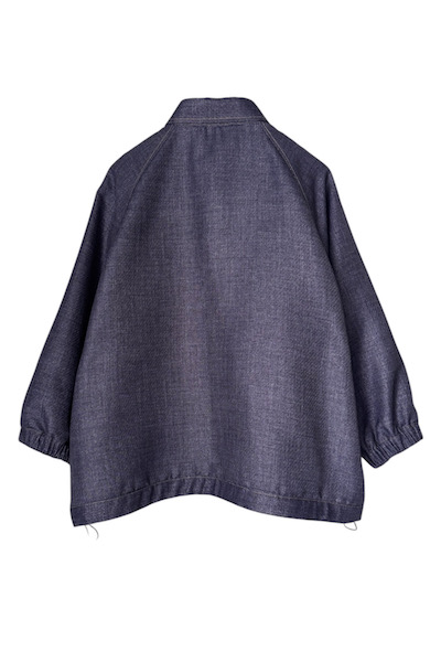ラメ糸の入ったブッチャー生地にデニム転写プリントを施した素材を使用。柔らかく、しなやかな風合いが特徴です。デザインはフロントがボタン開き仕様で羽織としてはもちろんですがシャツのようにも着用いただけます。袖口はゴムが入っているため丸みのあるシルエットが女性らしい印象を与えつつ実用性も兼ね備えています。裾はドローコードを使用しており絞ることでシルエットの変化をお楽しみいただけます。Quality