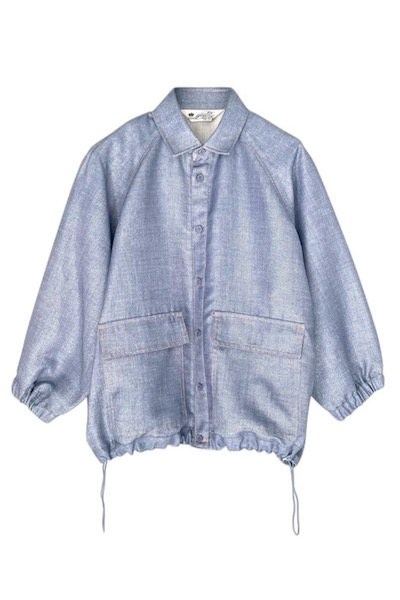 ラメ糸の入ったブッチャー生地にデニム転写プリントを施した素材を使用。柔らかく、しなやかな風合いが特徴です。デザインはフロントがボタン開き仕様で羽織としてはもちろんですがシャツのようにも着用いただけます。袖口はゴムが入っているため丸みのあるシルエットが女性らしい印象を与えつつ実用性も兼ね備えています。裾はドローコードを使用しており絞ることでシルエットの変化をお楽しみいただけます。Quality