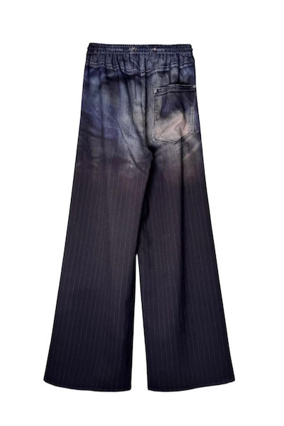 ヴィンテージデニムの表情を、3Dプリントで繊細に表現したドローストリングパンツ。色落ちやダメージのニュアンスまで丁寧に再現し、さらにグラデーションで施したピンストライプ柄がモードな印象に。柔らかな風合いのポリエステル素材を使用しており、見た目の存在感に反して軽やかな穿き心地です。ウエストはゴムとドローストリング仕様で、リラックス感がありながらもシルエットはすっきりとまとまります。カジュアルな要素を持ちながら、どこか洗練された雰囲気を感じさせる一本です。