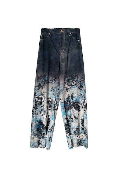 裾へ向かって広がるフローラルグラデーションプリントが印象的なデニムパンツ。程よい厚みの綿生地を使用し、存在感がありながらも日常に取り入れやすい一本に仕上げています。