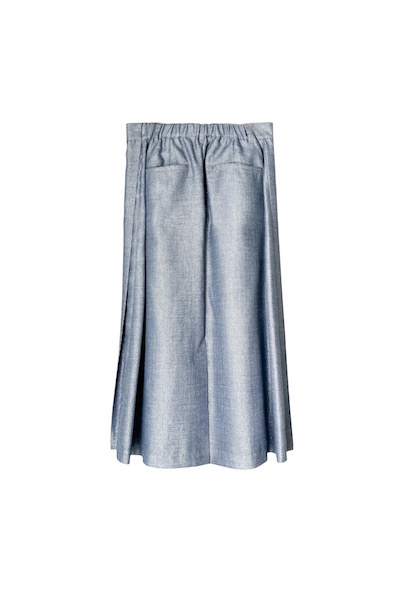 ラメ糸の入ったブッチャー生地にデニム転写プリントを施した、柔らかくしなやかな素材を使用。フロントはプリーツ、後ろはフラットなフレアシルエットのデザインで動きに合わせて表情の変わる一着。スポーティーからカジュアル、綺麗めまで幅広いスタイリングに相性が良いのも魅力的。サイドファスナー仕様で後ろウエストはゴムのため、フィット感がありつつもリラックスした穿き心地です。Quality
