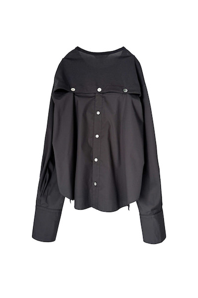 カットソーとストライプシャツの異素材を組み合わせたデザイントップス。前身頃はシンプルなカットソー、袖と後ろ身頃には高密度でなめらかな質感のストライプ生地を使用し、異なる表情のコントラストを楽しめる一着です。後ろ身頃の釦を外し、中に配置されている紐を留めることでキャミソールトップスに変化し、まったく別の表情に。