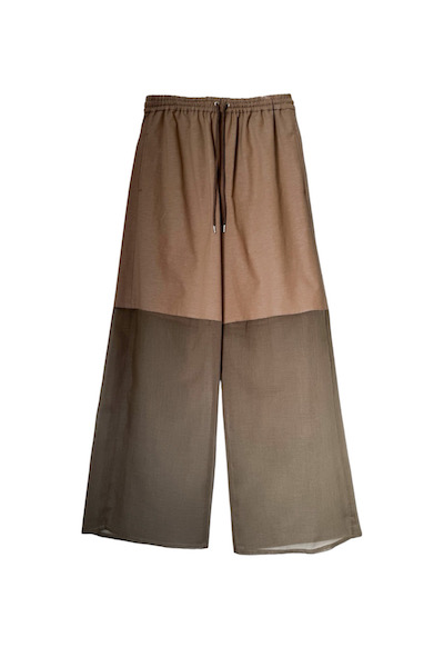 ソフトオーガンジーのシアー素材と、マットなコットンリネン素材を切り替えたイージーパンツ。透け感のある軽やかな表情と、ナチュラルな風合いが合わさり、抜け感のある印象に。