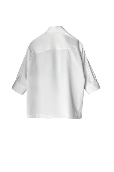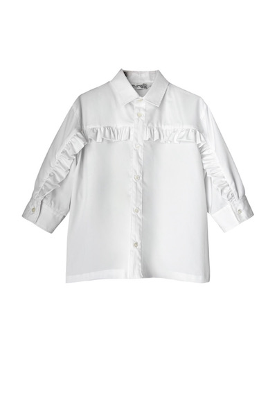身頃から袖にかけてフリルディテールを施したシャツ。生地はハリ感があり、UVカット、接触冷感などの機能を備えたブロードクロス素材。肌触りが良く、軽い着心地でゆとりのあるシルエットはストレスなく着用いただけます。袖はフリル部分に釦がついているので開けて着用することでスリットになり暑い夏にも快適です。トップスとしてはもちろん、フロントを開けて羽織としても着用いただけます。フェミニン過ぎず、カジュアルからきれいめスタイリングまで幅広く活躍する1着です。Quality
